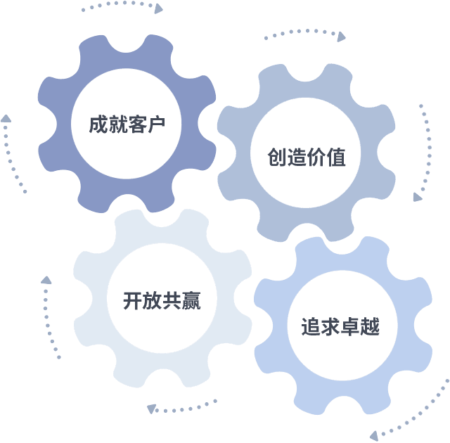 成就客户是一切决策的出发点,,,,创造价值是衡量所有工作的标准,,,,追求卓越是我们做事做人的态度,,开放共赢是我们的格局也是最终的结果。。。。价值观的齿轮环环相扣,,,推动着组织里的每个人不断向前。。